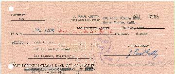 Getty's name and address printed above, drawn on Security First National Bank of Los Angeles, Santa