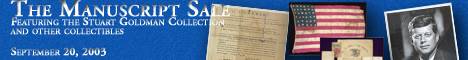 Sumner, Charles (1811-74) U.S. Senator from Massachusetts, abolitionist and Radical Republican. 1. Autograph Sentiment Signed, in pencil, on board the steamer Metropolis, Nov. 28, 1855: "Our cause is nobler than that of our Fathers, inasmuch as it is more exalted to struggle for the Freedom of others than for our own." On toned, 2½ x 5 in. blue paper. 2. Letter Signed, Senate Chamber, Dec. 24, 1872, one page octavo, to Wm. Howell Reed in Boston, regarding the French Spoliation Bill. One fold split affects "Sumner." 3. Octavo page with the last words of Charles Sumner, written by Judge Hoar and given to William Howell Reed. One of the utterances was "You must take care of the Civil Rights Bill, Judge." Very Good to Fine (3 items) (Photo). Estimate $300-400. |